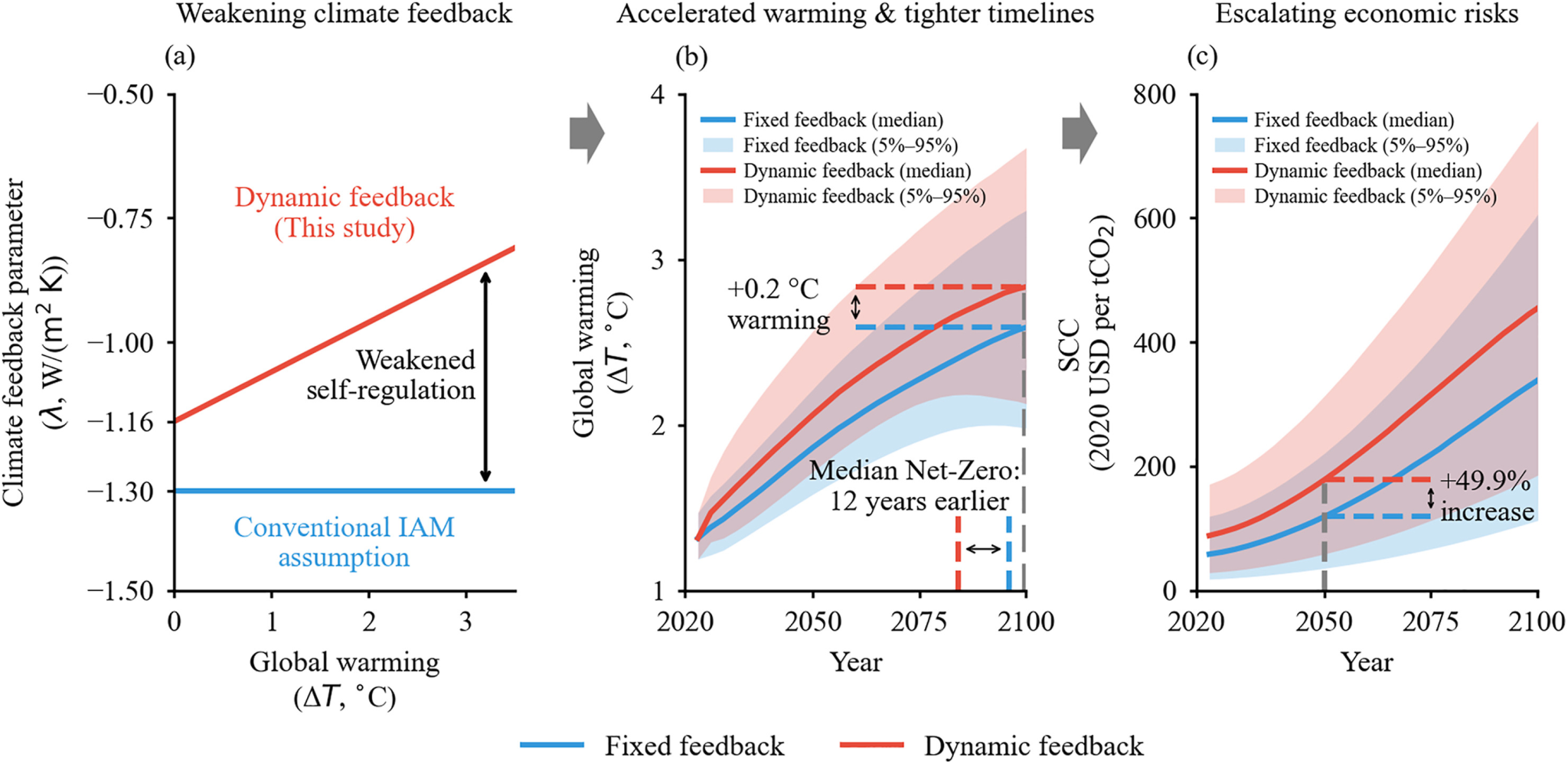 综合评估模型(Integrated Assessment Models, IAMs)是连接气候科学与社会经济决策的核心分析工具,被广泛应用于估算碳社会成本(Social Cost of Carbon, SCC)、探索减排路径和指导气候政策设计,其输出结果直接影响着IPCC情景框架与国际气候谈判。在当前我国推进“双碳”目标的关键时期,IAMs所提供的气候经济分析质量对政策制定的科学性至关重要。为了提升物理真实性,研究者通常将FaIR、MAGICC等简化气候模型(SimpleClimate Models, SCMs)嵌入IAM框架,以模拟温室气体浓度、辐射强迫和全球平均地表温度的动态演变。然而,现有SCMs普遍将净气候反馈参数(ג)视为固定常数,这与大量气候科学证据相悖——IPCC第六次评估报告(AR6)已高置信度地指出,随着地球持续升温,净气候反馈会逐渐减弱,该现象已被CMIP6地球系统模式模拟结果、古气候重建数据和观测分析所证实。这一结构性简化使传统SCMs忽视了气候系统的自我调节能力,可能导致对未来升温轨迹和气候经济风险的系统性低估,进而使政策制定者采纳过于乐观的基准情景,低估减排行动的紧迫性。