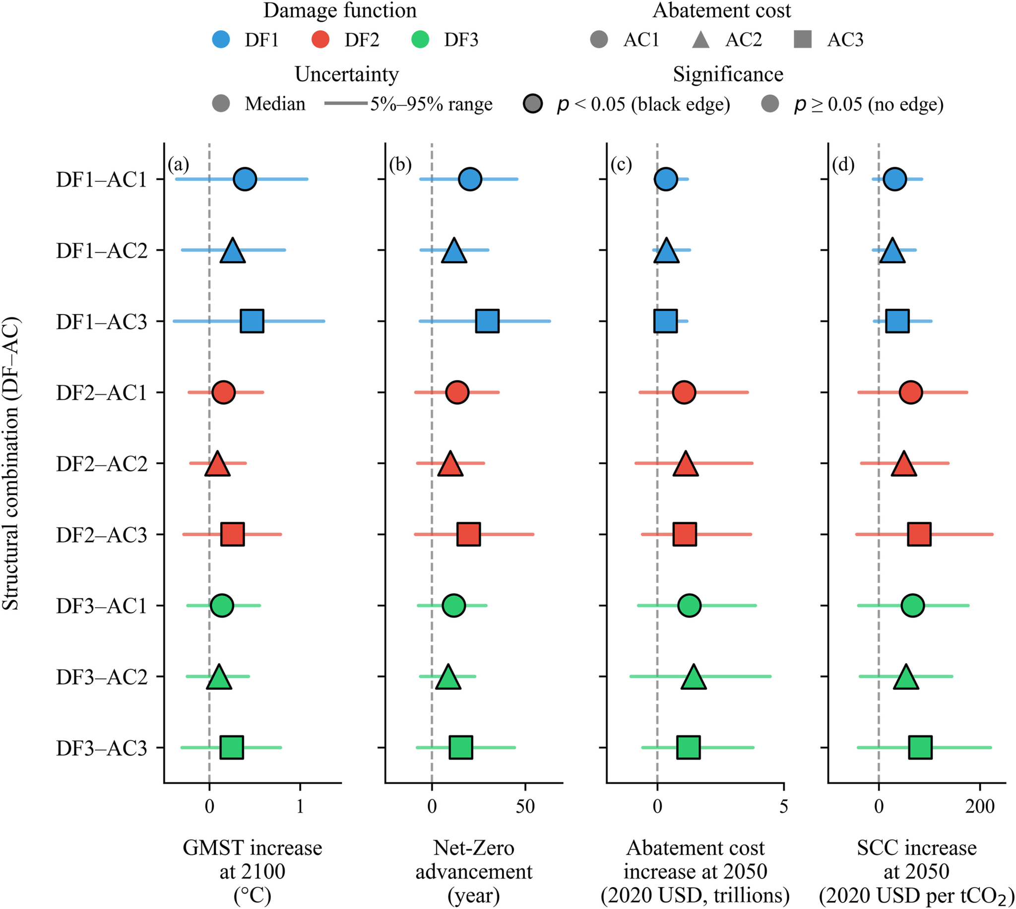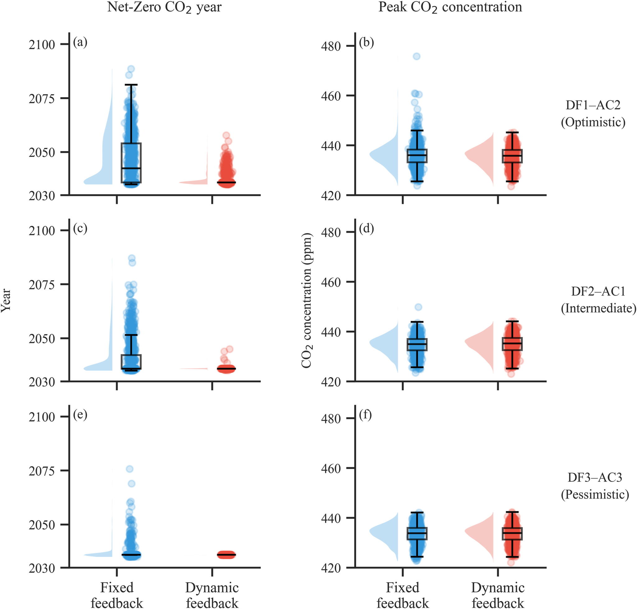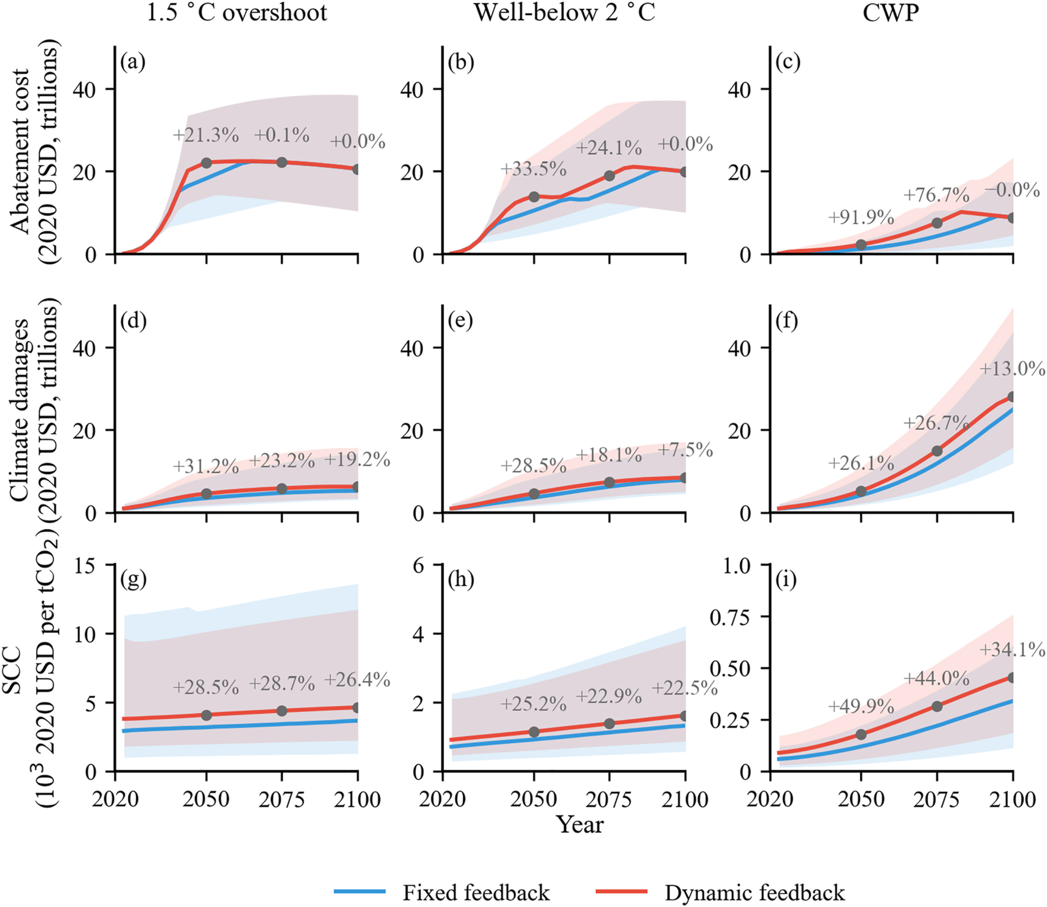 徐建军教授课题组联合北京理工大学魏一鸣教授团队,基于对29个CMIP6地球系统模式的标准化诊断分析,揭示了辐射通量与温度间的非线性关系,表明气候反馈参数随升温线性演变而非保持恒定。据此,研究团队将温度依赖的气候反馈机制耦合至DICE-FaIR综合评估框架,构建了1001个集合成员的概率分析体系,并通过九种结构配置(三种损害函数×三种减排成本曲线)系统评估了固定气候反馈假设对气候经济预估的系统性偏差。研究揭示三项关键发现:第一,动态反馈使各政策情景下的升温幅度系统性增加约0.2°C,揭示了传统SCMs对未来升温轨迹的持续性低估;第二,该偏差进一步传导至经济指标,在多种结构配置下碳社会成本(SCC)提升高达50%,凸显其作为模型结构性缺陷的普遍性,而非特定参数设置的偶然结果;第三,研究识别出“政策空间压缩”效应——动态反馈在同步放大超过临界温度阈值的尾部风险的同时,也收窄了净零排放(碳中和)的可行时间窗口,而固定反馈假设恰恰系统性掩盖了这一压缩效应,导致对可用政策空间的高估和对减排时间紧迫性的低估。在当前政策路径(CWP)下,减排成本和SCC分别最高增加91.9%和49.9%;为满足巴黎协定目标,CO2净零排放(碳中和)时间需最多提前12年。上述结论在三个政策情景、不同反馈强度敏感性实验( ꝩ= 0.05、0.1、0.15W/(m2K2))以及九种结构配置中均表现出显著的稳健性。