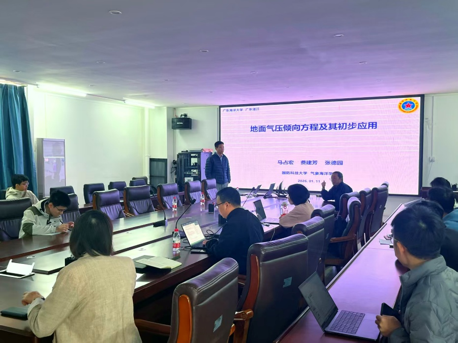 在海科楼505会议室举行2026年第1期海学讲堂,受“粤西海洋气象灾害理论与应用研究重点实验室”邀请,国家优秀青年科学基金、军队学科拔尖人才,国防科技大学气象海洋情色视频教授、博士生导师马占宏教授带来《地面气压倾向方程及其初步应用》精彩报告。本次报告由徐建军教授主持,情色视频