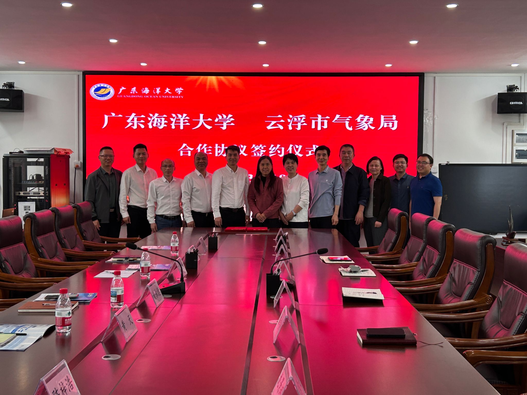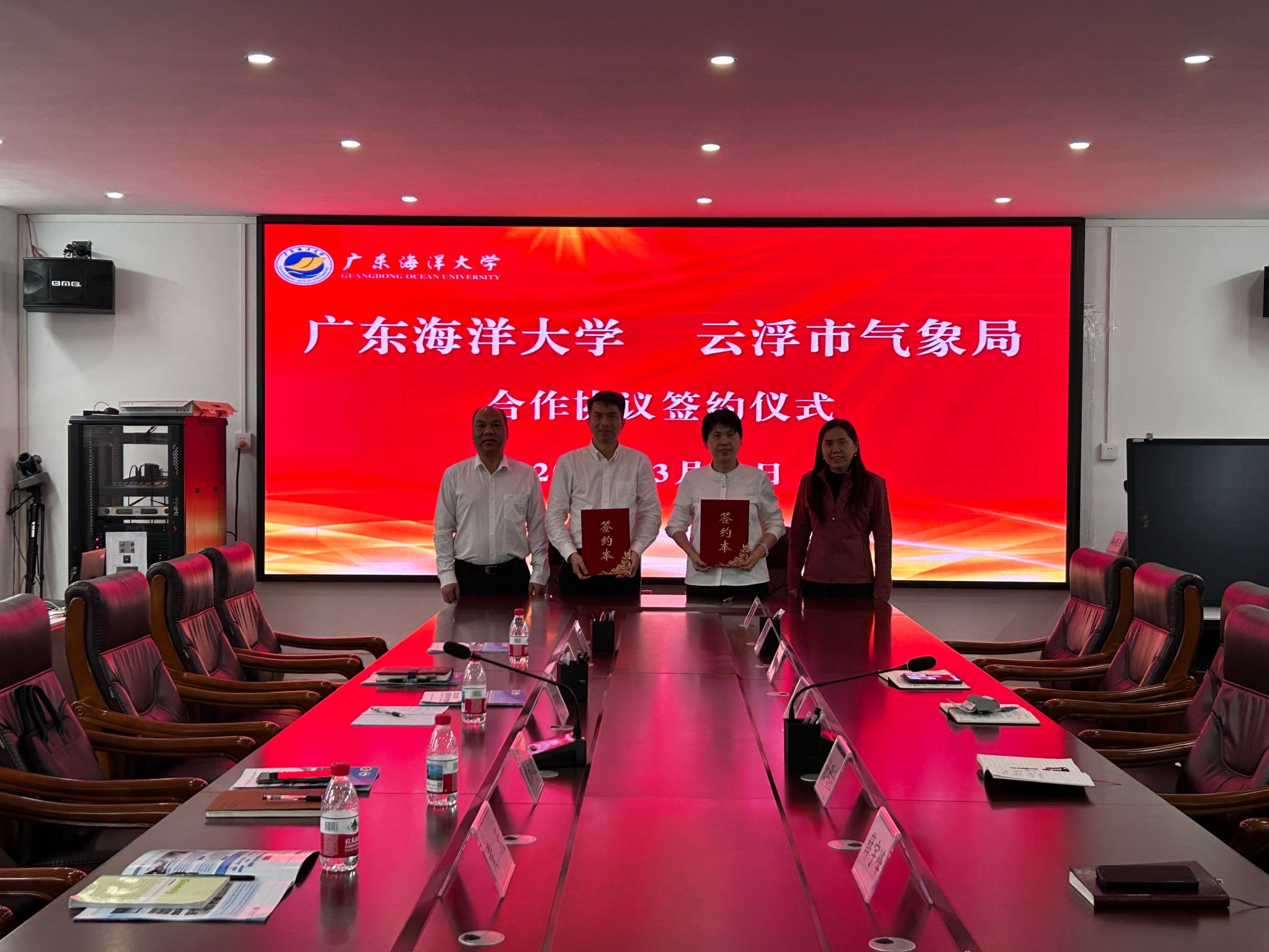 与云浮市气象局全面合作签约仪式在海科楼505会议室举行。情色视频院长谢玲玲、党委书记刘利群、副书记胡森林、副院长薛宇峰及教师代表;云浮市气象局党组书记、局长黄永德,副局长张志坤及相关部门负责人出席签约仪式。谢玲玲院长主持仪式。