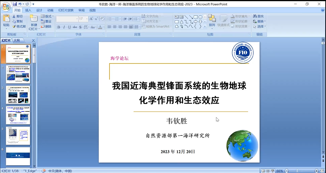 韦钦胜研究员的报告题目为:我国近海典型锋面系统的生物地球化学作用和生态效应。韦老师首先介绍了海洋锋面的基本知识,海洋锋面是2种或多种不同海水特征水团的交界面,锋面处的次级环流、辐聚效应及强混合等动力过程可显著影响到海洋中物质的输运与生物生产过程,故锋面区往往是全球的高初级生产力区域。接着,韦老师指出我国边缘海水系复杂,存在显著的海洋锋面系统,主要介绍了我国黄海、东海及长江口的锋面的位置、季节特征与机制类型,着重介绍了穿刺锋、羽状锋和离岸冲淡水锋的特性及其生物地球化学作用和生态效应。最后指出狭窄的锋面区域在海洋物质输运、生物生产、群落与生境区划等方面扮演着重要角色,深入理解锋面生态效应的形成与控制机制是生态系统预报预测的重要环节。