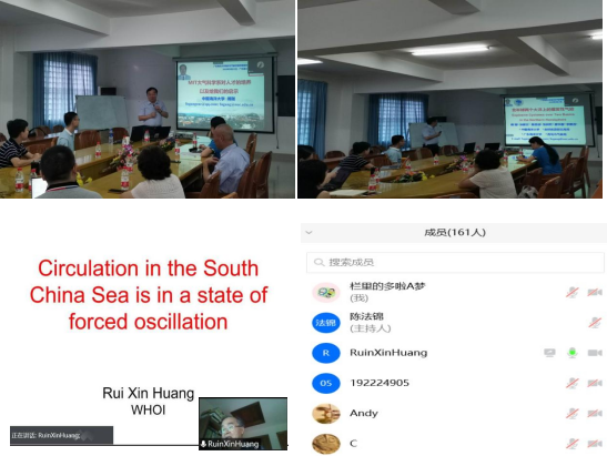 9月23日晚,黄瑞新教授应邀在腾迅会议线上作了题为“Circulation in South China Sea is a state of forced circulation”的报告。会上,针对南海环流的热点问题,黄瑞新教授利用理想封闭模式模拟了南海环流,指出由于南海海盆尺度较小,罗斯贝调整不充分导致南海环流呈现扰动强迫的特征,学术报告加深了广大师生对南海环流的认识,提供了关于南海环流研究的新思路,报告内容丰富,科研思路严谨,参会师生表示受到了极大的启发。