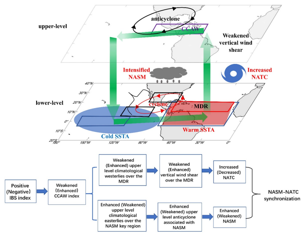 季风和热带气旋是全球性的重要大气现象,其活动异常可能会引起严重的自然灾害,季风和热带气旋活动的变异特征和机制一直是气候变化研究关注的重要课题。北美夏季风和北大西洋热带气旋活动的变异显著影响着北美的气候异常,北美夏季风和北大西洋热带气旋年际变异之间的可能联系在以往研究中还没有被揭示。该论文研究发现在年际尺度上北美夏季风的强度和北大西洋热带气旋的生成数量之间存在显著的正相关关系,这种正相关关系可以利用两种物理途径来进行解释:“热带海温驱动途径”和“季风热源驱动途径”。在热带海温驱动途径中(图1),热带太平洋-大西洋跨洋盆海温梯度(IBS)异常可以通过驱动大气对流层上层跨越美洲中部的纬向风(CCAW)异常,进而影响北大西洋热带气旋主要发展区(MDR)的垂直风切变和与北美夏季风相联系的高层大气异常反气旋,从而能够建立在年际时间尺度上北美夏季风强度和北大西洋热带气旋生成数量之间的正相关关系。在季风热源驱动途径中,与北美夏季风相关的降雨异常可以作为大气热源来激发大气环流异常,进而通过改变北大西洋热带气旋主要发展区上空的垂直风切变来影响北大西洋热带气旋的生成数量。考虑到北美夏季风与北大西洋热带气旋在年际时间尺度上的同步性,北美夏季风强度和北大西洋热带气旋生成数量在气候预测中可能可以一起综合来进行考虑,并且研究结果还提出春季的热带太平洋-大西洋海表温度异常可以作为北美夏季风强度与北大西洋热带气旋生成数量的一个前期气候预测因子。