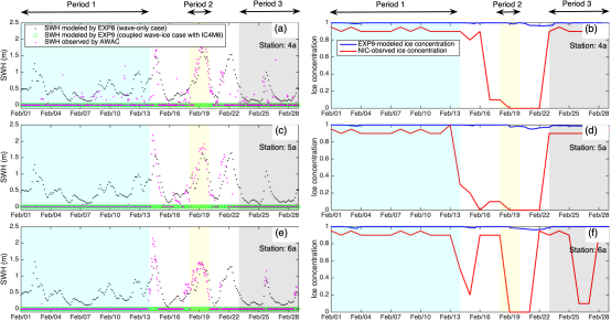 图1. 数值实验EXP8、EXP9模拟所得2011年2月份有效波高与AWAC实测有效波高在4a站(a),5a站(c),及6a站(e)处对比情况。数值实验EXP9模拟所得湖冰密集度与NIC湖冰产品在4a站(b),5a站(d),及6a站(f)处对比情况。